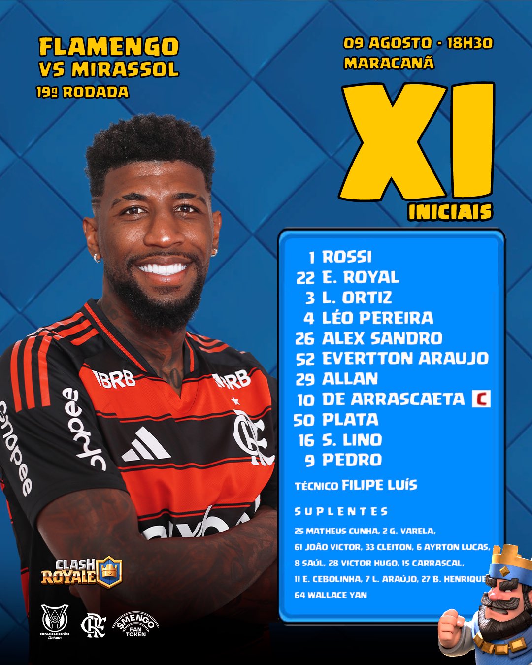 Teoricamente, e com todos os jogadores do elenco disponíveis, deveria ser: Rossi; Varela, Leo Ortiz, Leo Pereira e Ayrton Lucas; Pulgar, Jorginho, De la Cruz e Arrascaeta; Luís Araújo e Pedro.